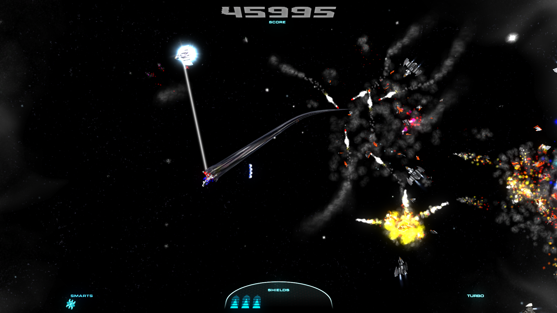 Heckabomb is a twin-stick shooter for PC with varied levels based in a circular arena. The ship has a host of upgradeable stats including bullet spread, rate of fire, turbo boosters and magnetic collectors. There are six varied add-on weapons too, including a chain-lightning gun, bullet-reflecting satellites and a rapid-fire swirly thing! (a legal requirement of any arcade shooter) Loads of different of enemies, including huge boss warships, missile batteries, tractor beams and a deadly enemy ace pilot will challenge your arcade reflexes and endurance.